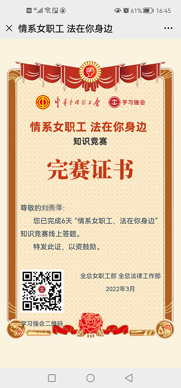 节日前夕,各党支部依托“三会一课”、职工微信群、“学习强国平台,专题学习了《中华人民共和国工会法》,围绕“情系女职工 法在你身边”主题,联合女工委组织参与了普法竞赛活动,进一步提高了女职工的法治意识和维护自身合法权益的能力