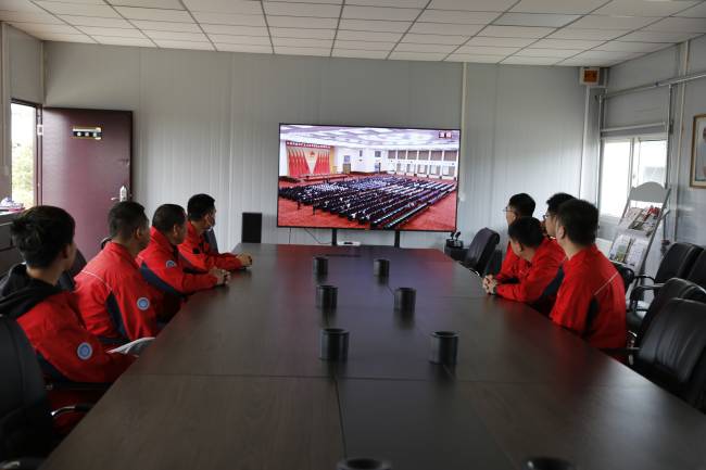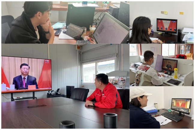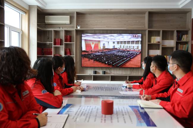 团干部在图书阅览室集中观看,各支部团员、项目一线青年通过手机、电脑等形式观看网络直播。