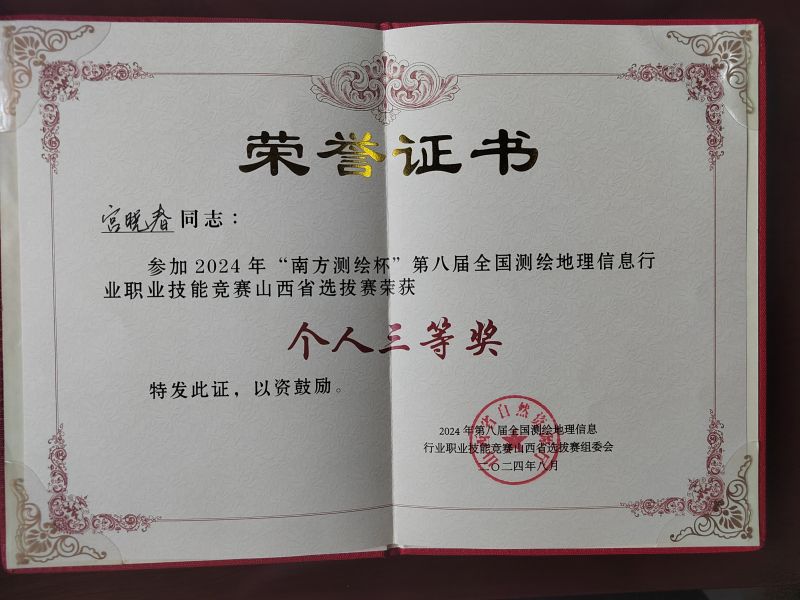 近日,由省自然资源厅、省人力资源和社会保障厅、省总工会联合举办的 2024 年“南方测绘杯”第八届全国测绘地理信息行业职业技能竞赛山西省选拔赛在晋中职业技术学院落幕。地勘院有限公司荣获团体优胜奖,两名职工获得个人三等奖。