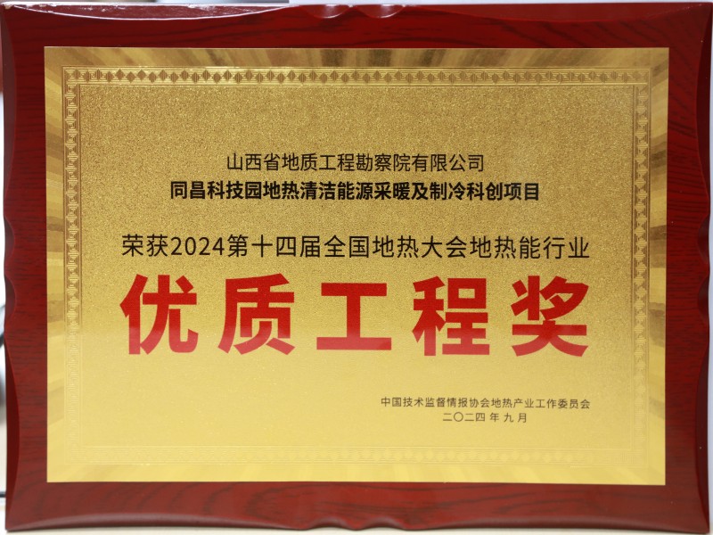 9月20日,以“开拓创新 拥抱地热新时代”为主题的2024第十四届全国地热大会在山东济南召开。地勘院有限公司同昌科技园地热清洁能源采暖及制冷科创项目荣获地热能行业“优质工程奖”。